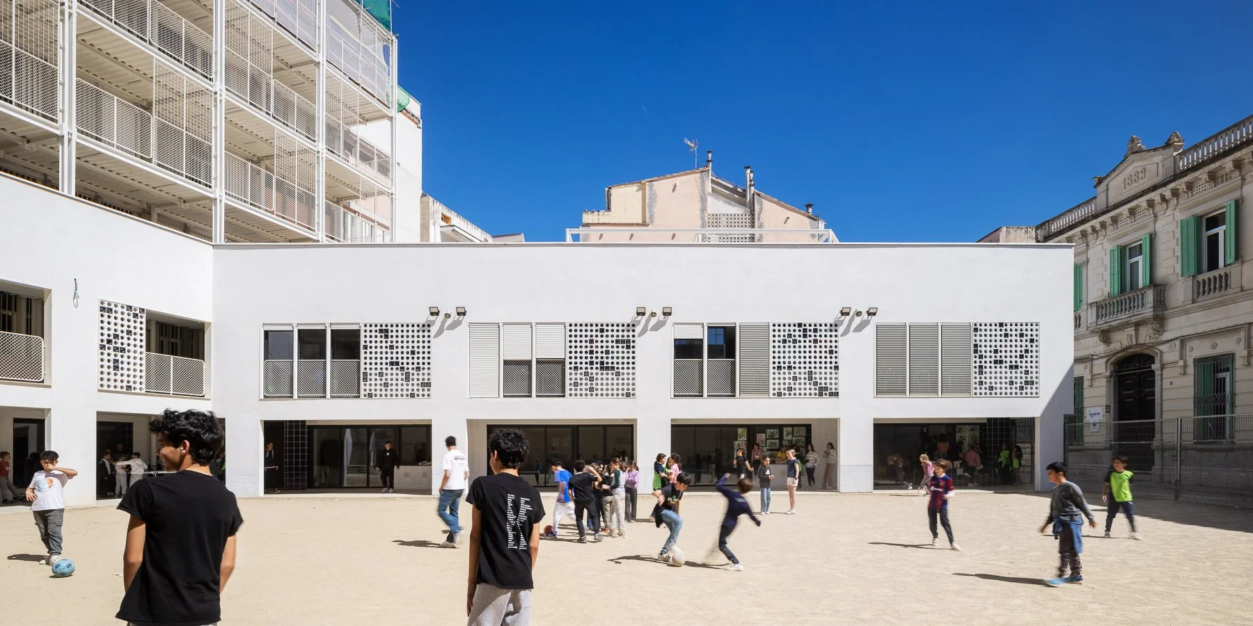 Un nuevo edificio, de pequeña escala e imagen en armonía con el casco antiguo, se sitúa formando una L con el edificio existente, para crear una única unidad funcional, y facilitar la conexión con la Escuela infantil situada delante. Asimismo, el nuevo edificio, libera un patio orientado a sur, visible y permeable desde la calle, mejorando las condiciones de paisaje urbano del entorno de la calle Sant Isidre. El nuevo edificio permite agrupar las distintas etapas educativas por plantas agrupadas y coherentes, cada una con el patio y el espacio educativo exterior.